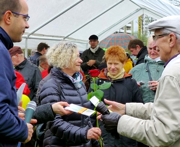 Seit 2007 gibt es den Hochzeits-Park. Junge Paare und ihre Angehörigen können ein 100-Euro-Gewächs bestellen und dort sich und anderen einen Erinnerungsbaum setzen. Der Park inmitten eines Wohngebietes wächst und gedeiht. Zweimal im Jahr ist Pflanztag, verbunden mit einem Frühlingsfest. Auch heute kamen wieder viele. Petra Pau war zu Gast.