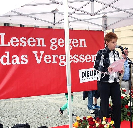 Am 10. Mai 1933 ließen die Nazis in Berlin und anderswo Studenten massenhaft Bücher undeutscher Schriftsteller verbrennen. Damit nahm die Prophezeiung von Heinrich Heine seinen braunen Lauf: Wer Bücher verbrennt, verbrennt zum Schluss auch Menschen. Petra Pau war heute erneut beim Lesen gegen das Vergessen dabei, ebenso die Zeitzeugin Elfriede Brüning.