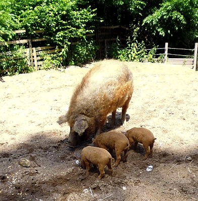 Petra Pau besuchte heute im Tierpark Kunsterspring ihre Patensau Gerda und deren drei Ungarischen Wollferkel (Mangalitza). Sie waren trotz Tropenhitze putzmunter. Für die Schweinebande stand heute Mais auf dem Speiseplan. Aber der hatte keine Chance gegen die Delikatesse, die Petra, Lena und Cèline den grunzenden Eltern der Kleinen vorwarfen.
