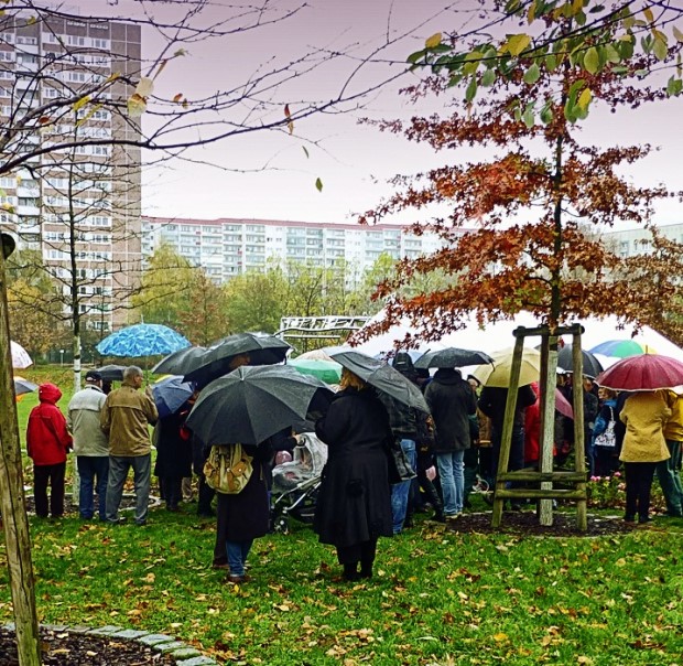 Im Hochzeitspark fand heute bei feuchtem Wetter die 12. Baumpflanzung statt. Teilnehmen können alle, die einschlägiges Fest zu feiern haben oder Mama oder Papa geworden sind. Petra Pau war erneut als Gast dabei. Außerdem besuchte sie zum Tag der Regional- und Heimatgeschichte die Ausstellung Marzahn-Hellersdorf im Dritten Reich.