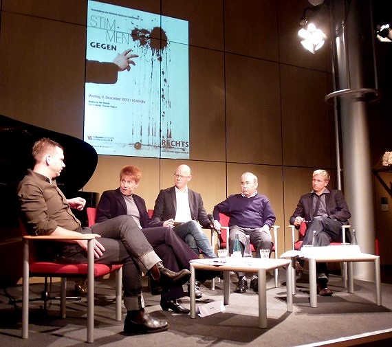 Stimmen gegen Rechts heißt eine Veranstaltungsserie des Verbandes deutscher Schriftsteller. Heute war sie in der Akademie der Künste zu Gast. Es gab literarische und musikalische Statement gegen Rassismus. Auf dem Podium wurde über das NSU-Nazi-Morddesaster debattiert. Vordem hatte Petra Pau in der Botschaft Südafrikas zum Tod von Nelson Mandela kondoliert.