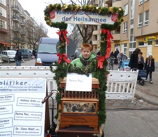 Berliner Kommunal-, Landes- und Bundespolitiker unterstützten heute schon erneut die Heilsarmee bei einer Sammelaktion auf dem Bio-Wochen-Markt am Kollwitz-Platz, auch Petra Pau war wieder dabei. Mit dem Erlös wird traditionell eine Weihnachtsfeier für Obdachlose und Bedürftige am 24. 12. 2013 in einem Berliner Hotel finanziert.