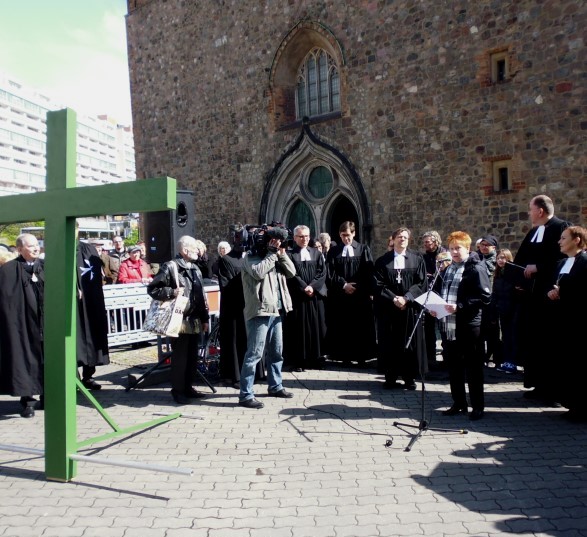 In Mitte fand heute eine gemeinsame Karfreitags-Prozession der katholischen und evangelischen Kirchen statt. An ihr nahmen rund 1.000 Gläubige teil. An sieben Orten erinnerten Geistliche und Politiker an historische Fehler der Kirche. Petra Pau sprach vor der Marien-Kirche. Im Vorfeld der Prozession hatten die Veranstalter dazu ein Interview mit ihr verbreitet.