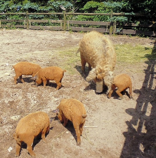 Petra Pau besuchte heute ihre Patensau Gerda im Tierpark Kunsterspring. Die hatte jüngst Nachwuchs geboren. Fünf von Sieben fühlen sich schweinewohl, drei Mädchen, zwei Jungs. Sie alle sind Mangalitza, ungarische Wollschweine, eine vom Aussterben bedrohte Art mit rötlichem Fell. Wie zur Mahnung war ausgerechnet heute Ferkel-Papa Alf gestorben..