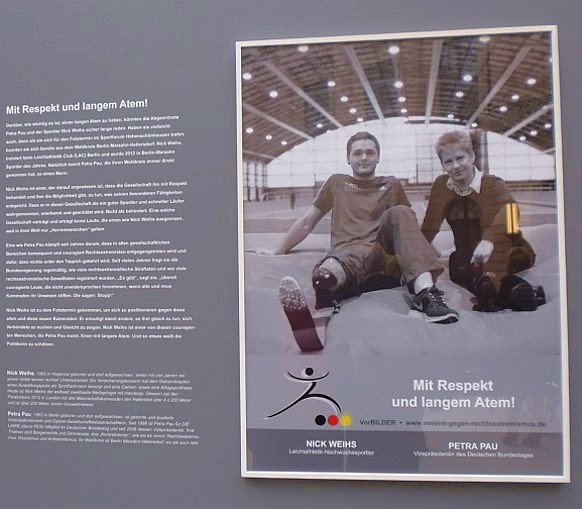 Im Schlüterhof im Zeughaus wurde heute die Wanderausstellung Gemeinsam Stärke zeigen - für Toleranz, Respekt und Menschenwürde vorgestellt. Auf Fotos werben Politikerinnen und Politiker sowie Sportlerinnen und Sportler vereint gegen Rechtsextremismus. Petra Pau wirbt gemeinsam mit dem Sprinter und Springer Nick Weihs für entsprechendes Engagement.