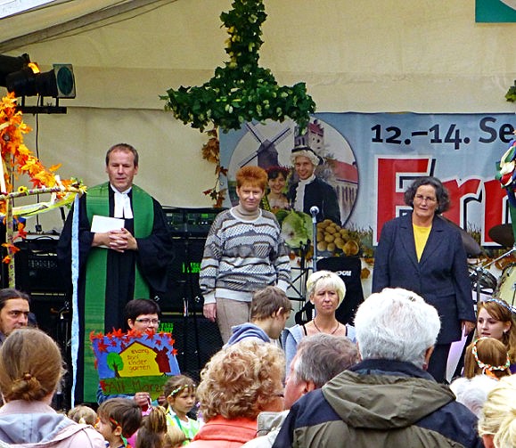 Der Bezirk im Nordosten Berlins wird aktuell 35 Jahre alt. Repräsentanten der Partnerstädte sind zum Jubiläum angereist. Heute wurde zudem in Alt-Marzahn das alljährliche Erntefest eröffnet. Die bekannte Bockwindmühle vor sanierten Hochhäusern wurde vor 20 Jahren aktiviert. Gründe zum Feiern in Marzahn-Hellersdorf, Petra Pau war auch heute dabei.