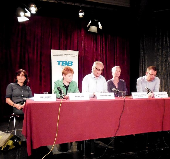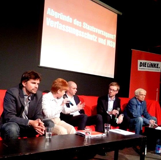 Abgründe des Staatsversagens - Verfassungsschutz und NSU war eine Diskussion im Theater Willy Praml überschrieben. Veranstalter waren die DIE LINKE und die Rosa-Luxemburg-Stiftung. Auf dem Podium: Dirk Laabs (Autor), Petra Pau (Linke), Alexander Kienzle (Anwalt), Christian Ströbele (Grüne), moderiert von Hanning Voigts (FR).
