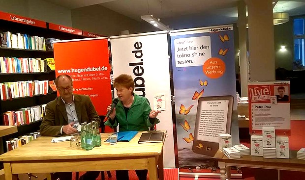 Eine namhafte Bücher-Kette veranstaltete heute Abend eine Lesung nebst Gespräch mit Petra Pau und ihrem Buch Gottlose Type - meine unfrisierten Erinnerungen. Sie erzählte, wie es überhaupt zu der Idee kam, 52 Anekdoten aus 25 Jahren aufzuschreiben. Und sie las als Zugabe die ungedruckte Geschichte Es ist kalt! mit Gregor Gysi und dem Papst.