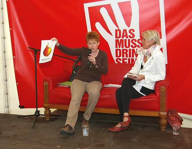 Ein verlängertes Wochenende lang feiern wieder rund 1000 Teilnehmerinnen und Teilnehmer Pfingsten mit der Linken am Werbellinsee. Erneut gibt es ein pralles Programm mit Sport, Politik und Kultur. Heute war auch Petra Pau mit ihrem Buch Gottlose Type im Kulturzelt zu Gast. Sie las daraus Anekdoten und sprach über aktuelle Politik.