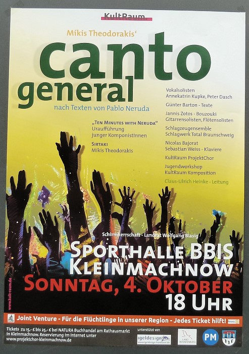 Der Verein KultRaum e. V. bot heute in der Sporthalle der BBIS eine Aufführung aus Canto General von Pablo Neruda und Mikis Theodorakis an. Petra Pau war unter den Gästen. Anlass für das Konzert war der 90. Geburtstag des Komponisten und 25 Jahre Deutsche Einheit. Es war der Menschlichkeit gewidmet und erbrachte Spenden für die Flüchtlingshilfe.