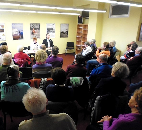 Petra Pau traf sich heute mit dem Vorstand von Vision e. V.. Es ging um Projekte zur Stärkung des Gemeinwesens und um die Auseinandersetzung mit deutschen und russischen Nazis. Später las sie im Frauenzentrum Mathilde Episoden aus ihrem Buch Gottlose Type - meine unfrisierten Erinnerungen, Eulenspiegel-Verlag, 2. Auflage.