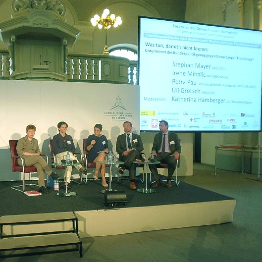 Das nunmehr 16. Symposium zum Flüchtlingsschutz fand gestern und heute in der Evangelischen Akademie am Gendarmen-Markt statt. Es stand unter dem Motto Europa an der Grenze: Die Krise und die Zukunft des Flüchtlingsschutzes. Den Abschluss bildete eine Podiumsdiskussion mit Politikern aus allen Bundestagsfraktionen zum Thema Gewalt gegen Flüchtlinge.