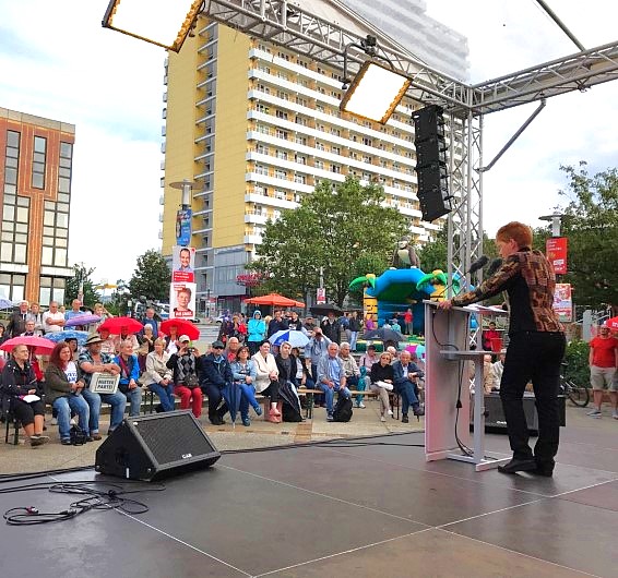 Vor 40 Jahren wurde der Grundstein für WBS-70-Großsiedlungen gelegt. Daran wurde heute erinnert. Nachmittags fand auf dem Helene-Weigel-Platz eine zentrale Wahlkampfkundgebung der Partei DIE LINKE statt. Andrej und David Hermlin sorgten für musikalischen Schwung. Da Gregor Gysi als Hauptredner kurzfristig ausfiel, sprang Petra Pau ein.