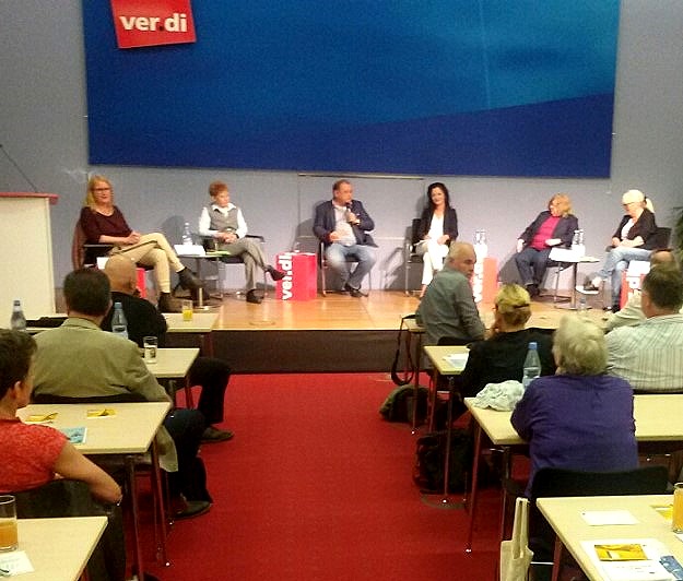 Der ver.di-Landesverband Berlin-Brandenburg hatte heute Vertreterinnen aller im Bundestag vertretenen Parteien aufs Podium geladen. Petra Pau sprach für DIE LINKE. Es ging u. a. um faire Löhne, armutsfeste Renten und sichere Arbeitsplätze. Vordem hatte sie an einer Gesprächsrunde der Süddeutschen Zeitung über gesellschaftliche Perspektiven teilgenommen.