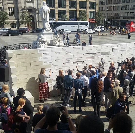 Auf Initiative der Hilfsorganisation Care wurde heute auf dem Gendarmenmarkt unter dem Motto Hass baut Mauern, Menschlichkeit reißt sie ein& eine Mauer mit Hass-Parolen zum Einsturz gebracht. Petra Pau nahm an der Aktion teil. Später agierte sie auf Einladung von Bussiness and Professional Women - Berlin für die Partei DIE LINKE auf einem Wahlkampfpodium.