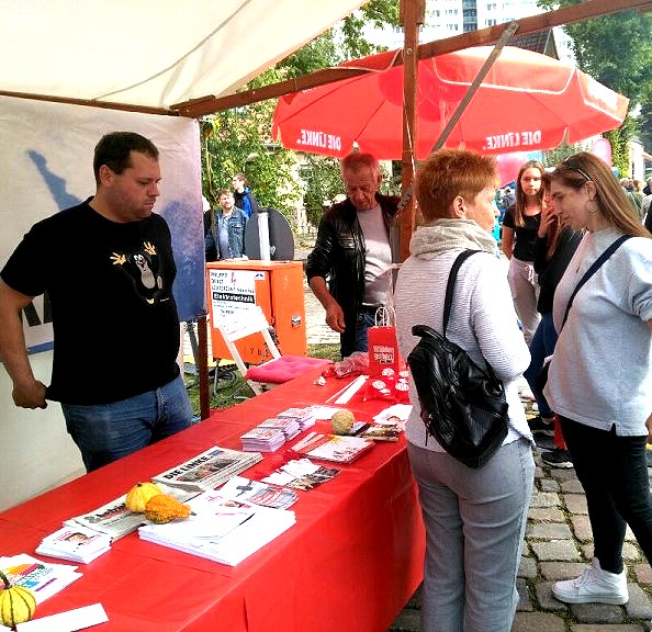 13. 09. 2017, Berlin: Der Tag begann heute mit einer munteren Diskussion von Bundestagskandidaten mit Schülerinnen und Schülern an der Spandauer Martin-Buber-Oberschule. Es folgten zwei Sprechstunden für Bürgerinnen und Bürger im Wahlkreis Marzahn- Hellersdorf. Dort und am Infostand vor dem MIX-Markt ging es u. a. um bezahlbares Wohnen, um die Abwendung einer Zwangsräumung, um den Ausbau eines Kindergartens sowie um Perspektiven für demokratische LINKE in der Türkei und in Russland.