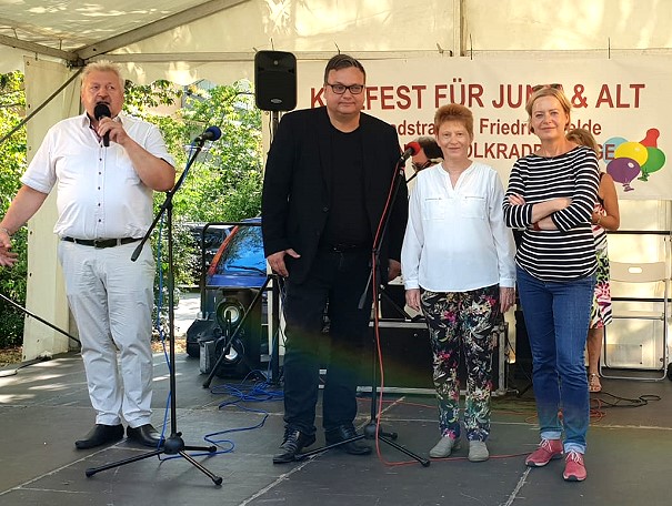 In der Volkradstraße wurde heute gefeiert. Zum 10. Mal präsentierten sich Vereine, Initiativen und Einrichtungen aus dem Kiez. Bürgermeister Michael Grunst ehrte gemeinsam mit Gesine Lötzsch und Petra Pau engagierte Bürgerinnen und Bürger mit der Ehrenamtskarte. Alle hatten Spaß und Appetit, z. B. an der Gulaschkanone des Hauses Abendsonne.