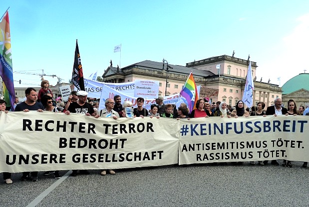 Gegen Antisemitismus und Rassismus waren heute eine Kundgebung auf dem August-Bebel-Platz und eine anschließende Demonstration zur Neuen Synagoge überschrieben. Rund 13.000 Leute nahmen teil, auch Petra Pau. Aufgerufen dazu hatte u. a. die Initiative unteilbar. Anlass war ein rechtsextremer Terrorakt in Halle/Sa. mit antisemitischer Gesinnung.