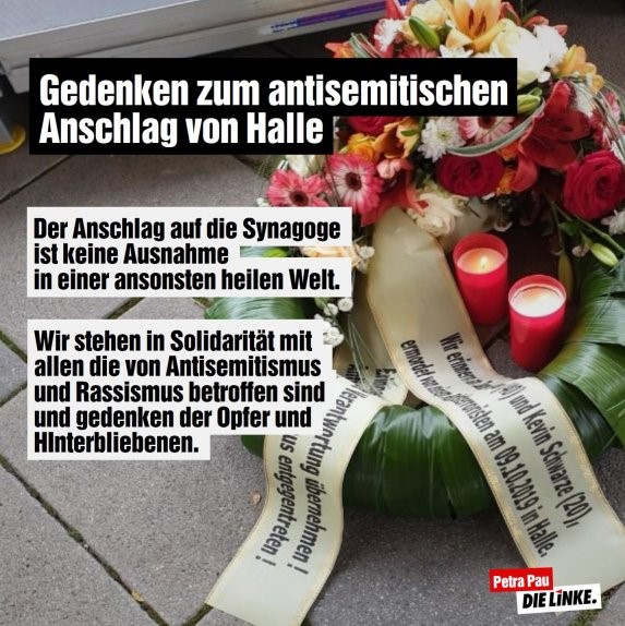 Vor einem Jahr versuchte ein Rechtsextremist aus dem Mansfelder Land die in der Synagoge Halle betenden Jüdinnen und Juden mit einem Sprengstoffanschlag zu ermorden. Als das misslang, tötete der Rassist zwei andere Personen. An diese Gewaltserie wurde heute in der Saale-Stadt mit zahlreichen Veranstaltungen erinnert. Petra Pau nahm daran teil.
