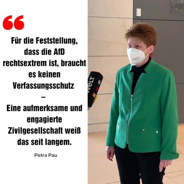 Die Alternative für Deutschland (AfD) wurde heute ob rassistischer und rechtsextremer Positionen offiziell zum Beobachtungsobjekt durch Ämter für Verfassungsschutz (VS) erklärt. Das wird vielfach befürwortet, nicht aber durch Petra Pau. Die VS-Ämter sind kein Teil der Lösung, sondern Teil des Problems, wie man aus Erfahrung, u. a. dem NSU-Desaster, weiß.