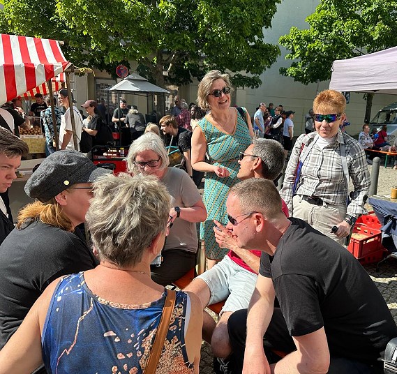 Einmal im Monat, Samstags, verteilt das Deutsche-Rote-Kreuz (DRK), Kreisverband Nord-Ost, kostenlos Lebensmittel an Bedürftige. Petra Pau half auch heute wieder dabei. Danach nahm sie an der Eröffnung des 10. Nachbarschaftsfestes auf dem Victor-Klemperer-Platz teil, veranstaltet vom Bündnis für Demokratie und Toleranz.