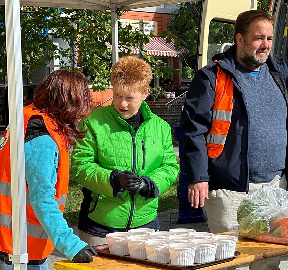 Einmal im Monat verteilt das DRK-Süd-Ost auf dem Helene-Weigel-Platz kostenlose Lebensmittel an Sozialbedürftige, so auch heute. Petra Pau war erneut dabei und half bei der Essenausgabe. Die Zahl derer, die ein warmes Essen erbitten, ist groß und wächst. Die zunehmende Armut in einem reichen Land ist fatal.