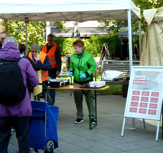 Monatlich verteilt das Deutsche-Rote-Kreuz (DRK) Nord-Ost auf dem Helene-Weigel-Platz Lebensmittel an Bedürftige. Deren Warteschlange wird dabei immer länger. Petra Pau ist Patin des DRK-Verbandes und half auch heute wieder bei deren Solidar-Aktion in ihrem Wahlkreis. Unter anderen gab es Suppe und Vitamine.