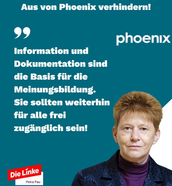 Die Spartensender von ARD und ZDF sollen demnächst reduziert werden, es könnte dabei auch phoenix treffen. Auch Petra Pau hat eine Petition gezeichnet in welcher der Erhalt des Senders und echte Veränderungen im öffentlich-rechtlichen Rundfunk gefordert werden. U. a. weniger externe Einflussnahme durch Werbung, transparente Strukturen und eine faire Finanzierung.