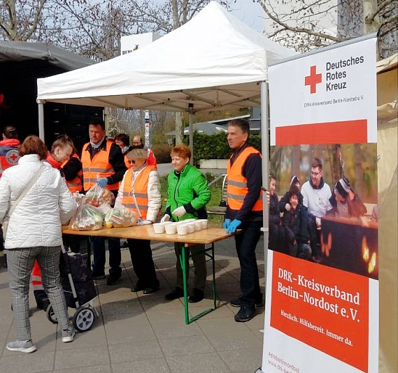 Seit 5 Jahren verteilt das DRK Nord-Ost an jedem letzten Sonnabend des Monats auf dem Helene-Weigel-Platz Lebensmittelpakete und eine warme Suppe. Auch heute fanden sich wieder rund 800 Bedürftige dazu ein. Petra Pau half als Botschafterin des DRK bei der Verteilung, auch ohne MdB-Mandat bleibt sie dabei.