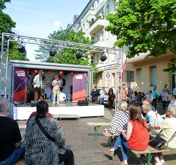 Traditionell fand im Bötzow-Viertel wieder ein Mai-Fest mit Kundgebung statt. Petra Pau gehörte zu den Rednerinnen und Rednern. Sie kritisierte, dass im Jahr 35 der deutschen Einheit im Osten noch immer für weniger Lohn länger gearbeitet werden muss, als im Westen, und mahnte, im Kampf gegen Rechtsextremismus und Antisemitismus nicht nachzulassen.