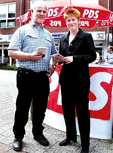 Löhne. Aus der knalligen Sonne des PDS-Standes auf der Lübbecker Straße flüchtete Petra Pau schnell unter die Sonnenschirme der Eisdiele. Die PDS-Spitzenpolitikerin machte am Donnerstag auf ihrer Wahlkampftournee in Löhne Station, um den heimischen PDS-Kandidaten Ulrich Adler zu unterstützen.